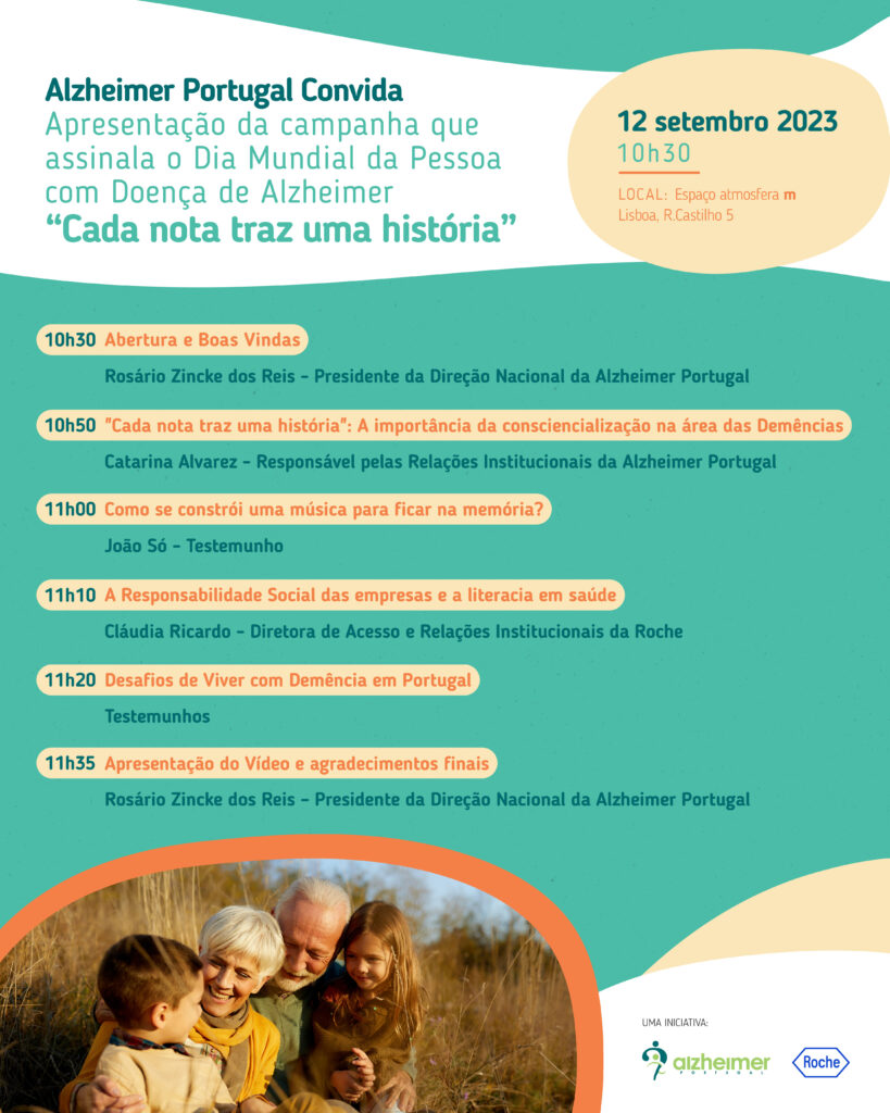 A Alzheimer Portugal faz a apresentação pública da sua campanha anual, que assinala o Dia Mundial da Pessoa com a Doença de Alzheimer, no próximo dia 12 de setembro, pelas 10h30 horas, no espaço atmosfera m em Lisboa.