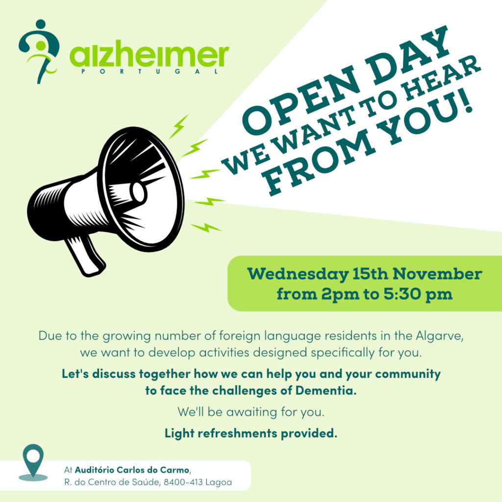 A Alzheimer Portugal – Núcleo do Algarve irá realizar no próximo dia 15 de novembro no Auditório Carlos do Carmo em Lagoa, um dia aberto para receber a comunidade estrangeira e ouvir quais as suas necessidades e poder desenvolver projetos específicos para esta população.
