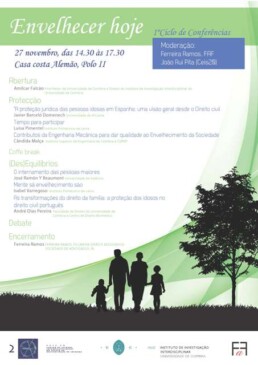 No próximo dia 27 de novembro, ocorre o 1º ciclo de Conferências «Envelhecer Hoje» na Casa Costa Alemão, Polo II do Instituto de Investigação Interdisciplinar da Universidade de Coimbra. Este ciclo decorre entre as 14h30 e as 17h30 e aborda temáticas como a proteção dos idosos no direito civil português e o envelhecimento são.