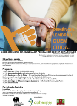 O Dia Mundial da Doença de Alzheimer, comemora-se a 21 de Setembro e, para o assinalar, o Núcleo Aveiro da Alzheimer Portugal, em parceria com a Unidade de Cuidados na Comunidade, do Centro de Saúde de Aveiro, irão promover uma acção de Sensibilização/ informação sobre a Demência, denominada “Demência: Lembrar quem CUIDA”.