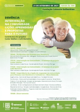 No dia Mundial da Pessoa com Doença de Alzheimer, 21 de setembro, a Alzheimer Portugal e a Fundação Calouste Gulbenkian vão promover um Encontro sobre Demência: “Intervenção na Comunidade: Lições aprendidas e Propostas para o Futuro – os contributos dos Projetos Cuidar Melhor e Café Memória”.