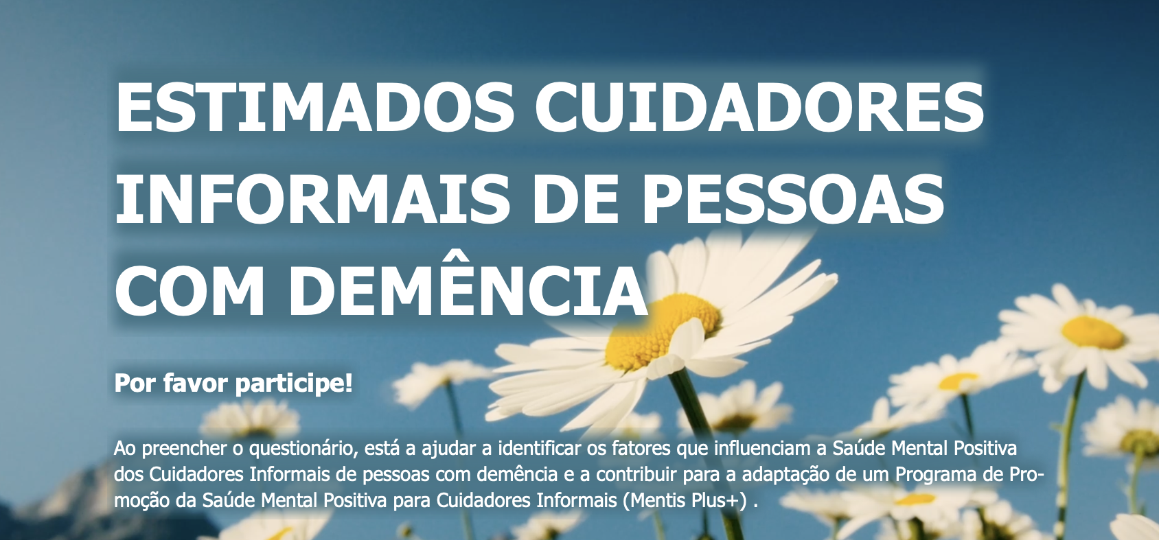 Este estudo é de Sofia Canedo Garrido e realiza-se no âmbito de um projeto que visa adaptar e avaliar a eficácia de um Programa de Promoção da Saúde Mental Positiva — Mentis Plus+, para cuidadores informais de Pessoas com Demência.