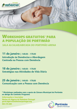 Em janeiro o Núcleo do Algarve da Alzheimer Portugal vai realizar 3 workshops gratuitos, ao abrigo do contrato programa com a Câmara Municipal de Portimão, destinados à população do município.