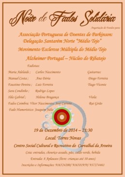 Terá lugar a 19 de dezembro de 2014, pelas 21h30, no Centro Social Cultural e Recreativo do Carvalhal da Aroeira, uma Noite de Fados Solidária, com angariação de fundos para 3 instituições: