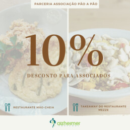 A Alzheimer Portugal, em parceria com a Associação Pão a Pão, oferece a todos os Associados um desconto de 10% no Restaurante Mão-Cheia (reaberto, desde dia 20 de maio) e no TakeAway do Restaurante Mezze (levantamento em loja).