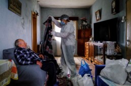 Pela sala estão espalhadas fotografias dos filhos e netos, cada um com sua história. Manuel Pimenta sabe bem por que razão não pode agora ir para o centro: “Por causa da doença. Diz que em Espanha tem morrido muita gente.” Emília chega, finalmente, para contar que afinal andava a estender roupa. Tem 78 anos, queixa-se de mazelas várias. Conta que o marido “já esteve pior”, que há uns 8 anos começou a decair. Foi quando teve o primeiro AVC, que “lhe matou metade das células da cabeça”. Mais tarde, um segundo acidente vascular acabaria por paralisar-lhe as pernas. Nunca mais andou. Dar-lhe banho era uma dificuldade, por isso a ajuda das técnicas revela-se preciosa. Mas há outras ajudas, de outra dimensão.