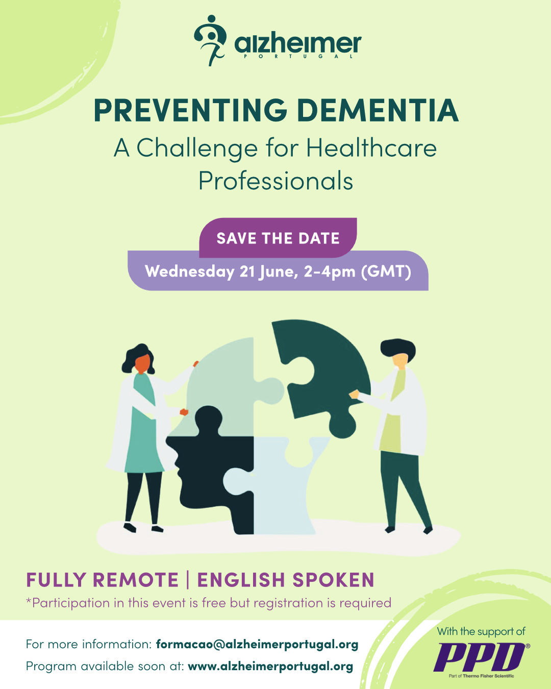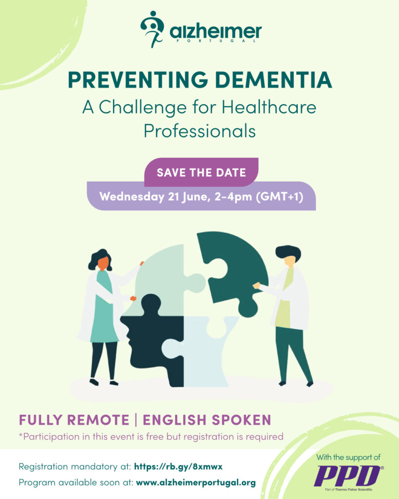 The webinar “Preventing Dementia – a challenge for health professionals,” organised by Alzheimer Portugal, with the support of the company PPD, will take place on the 21st of June, from 2 pm to 4 pm (the language of the event is English).